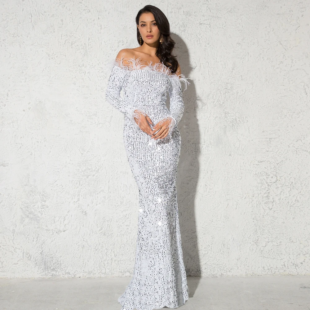 BEST SELLER Black Burgundy Shiny Sequin Party Dress Feather Long Sleeve Floor Length Dress Slash Neck Stretchy