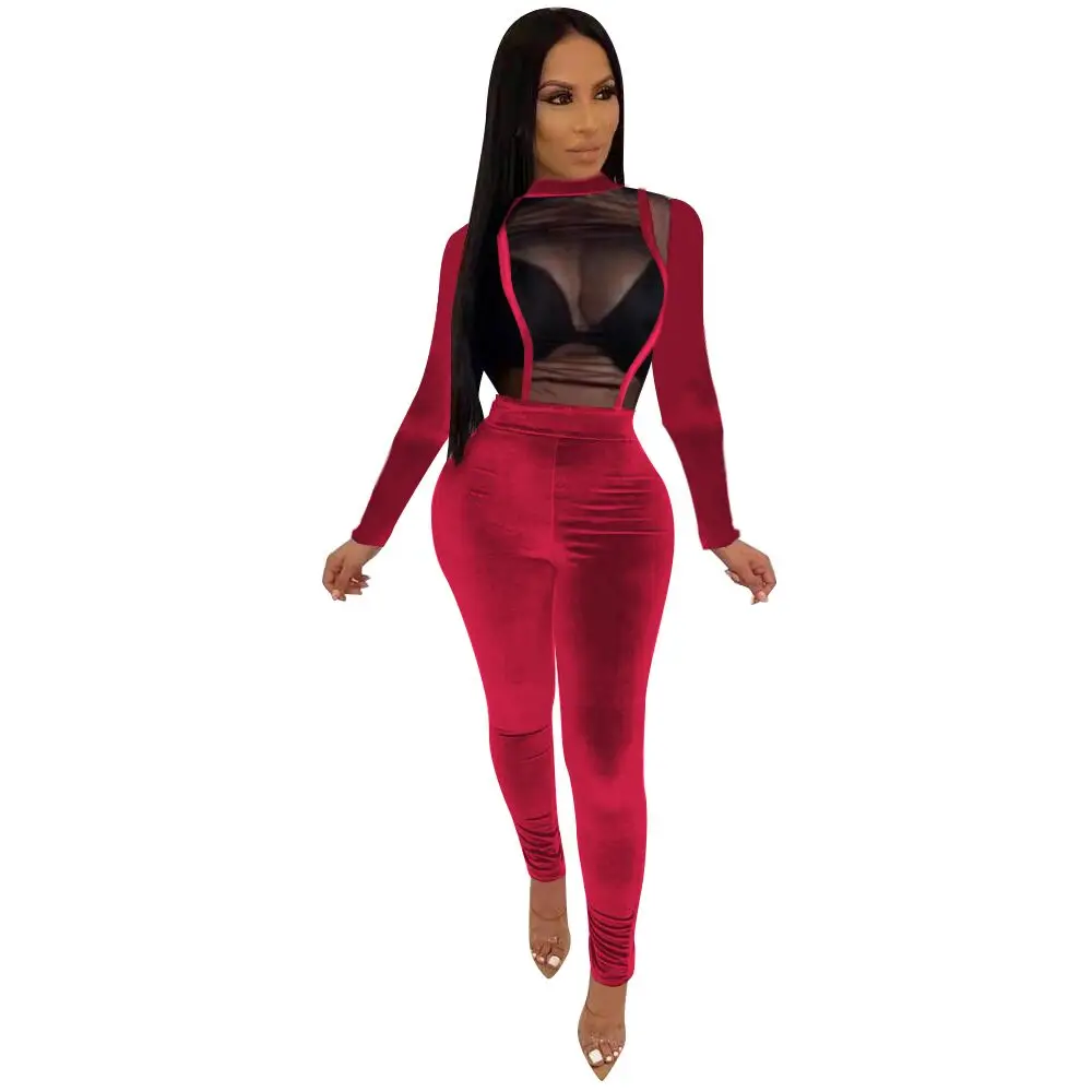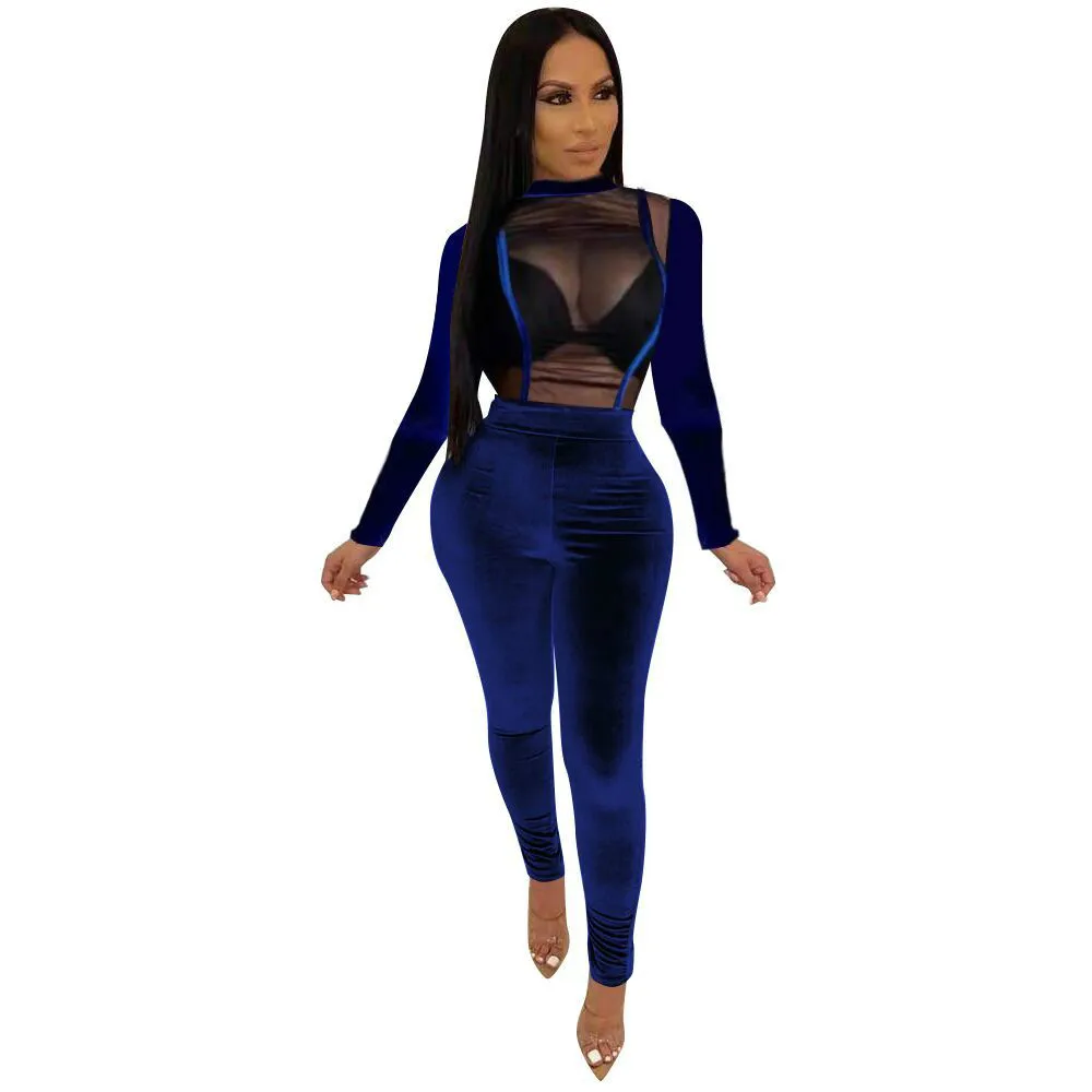 ORIGINAL Spring Sexy Jumpsuit Women Velvet Mesh Perspective O-neck Full Sleeve Rompers Club Night Party One